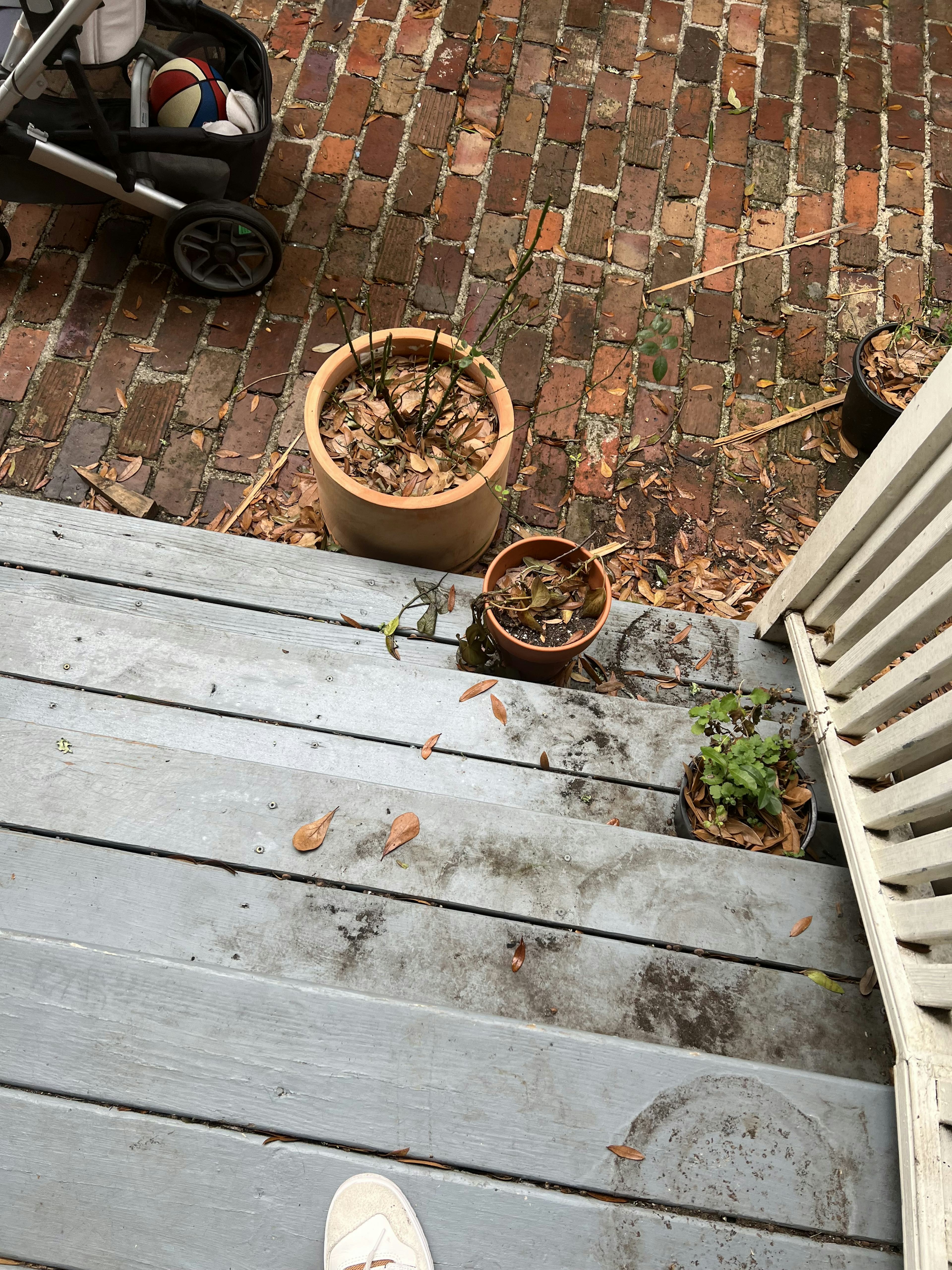 Would love some advice. My potted plants are discoloring my deck stairs. Is it the paint? Or should I consider upgrading to TREX boards? Any help is much appreciated!!